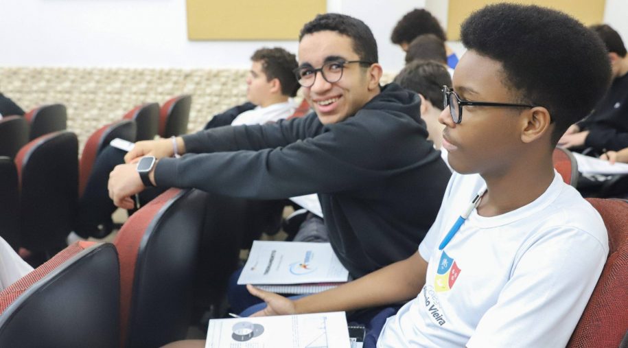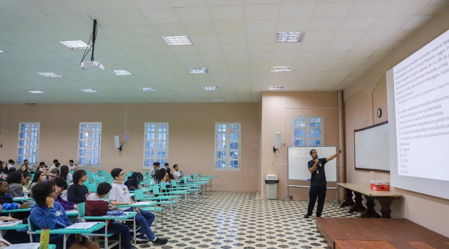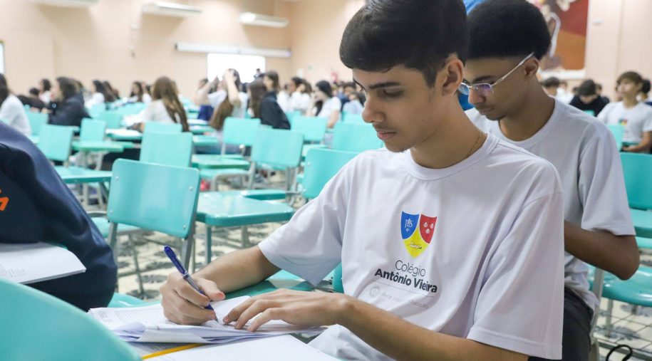 Com as provas do Exame Nacional do Ensino Médio (Enem) a serem realizadas nos próximos domingos, 9 e 16, os aulões de revisão com resolução de questões de edições de anos anteriores do exame marcaram a semana para os estudantes do Colégio Antônio Vieira, sobretudo, da 3ª série do Ensino Médio. Para também já se adaptar à dinâmica de preparação para o Exame e compreender a importância dos conhecimentos conquistados no Ensino Fundamental (EF) como basilares na construção das novas aprendizagens do Ensino Médio (EM), até mesmo os estudantes do 9º ano EF tiveram aulões Enem, na Sala de Arte Sálua Chequer e no Salão Anísio Teixeira. Confira no vídeo a proposta pedagógica!
