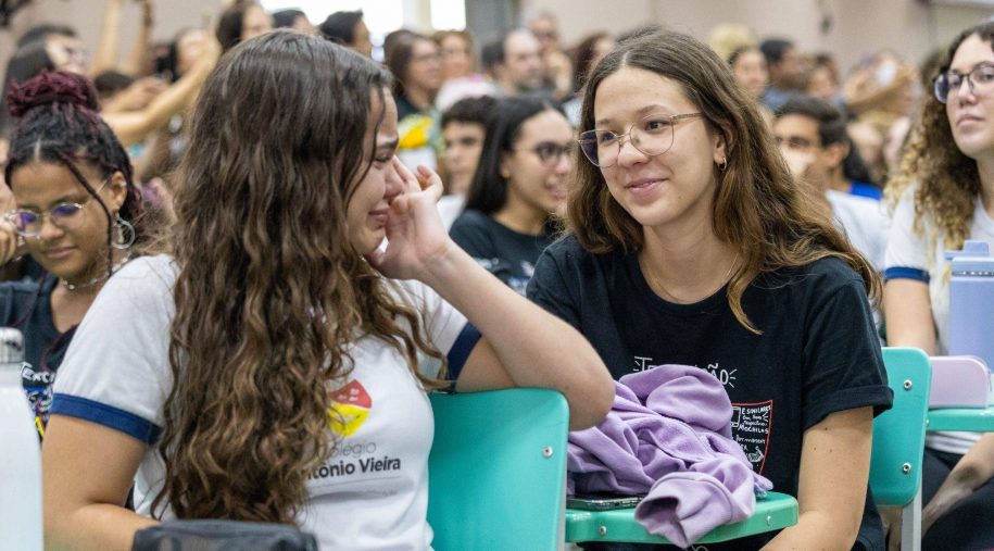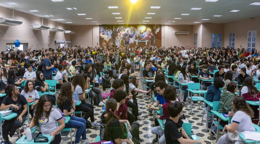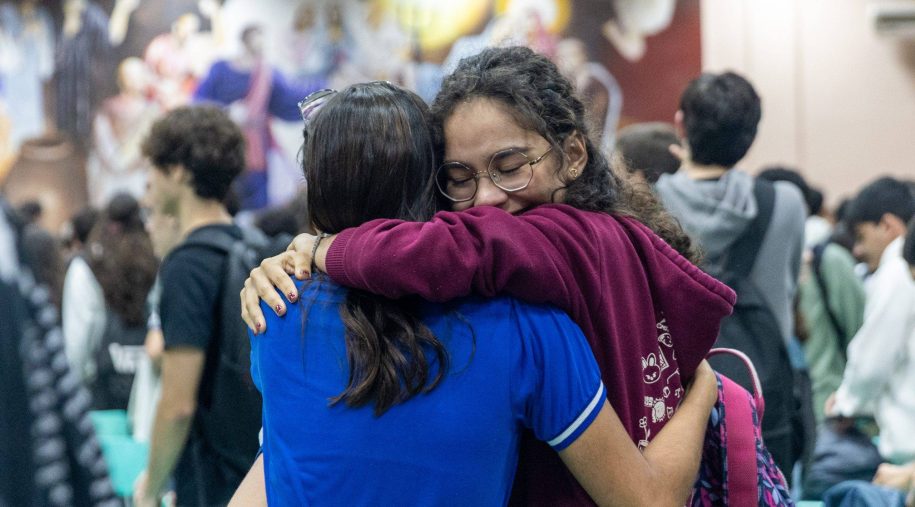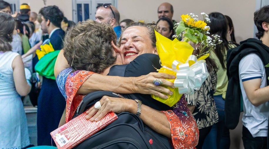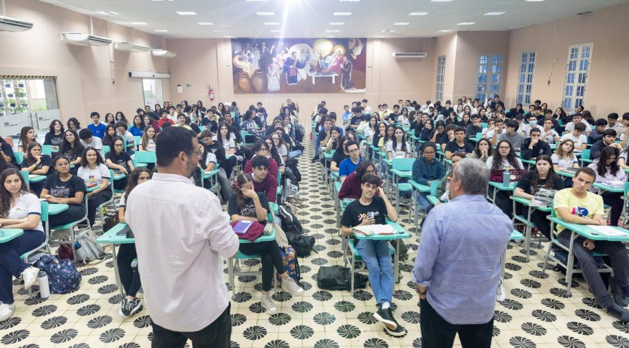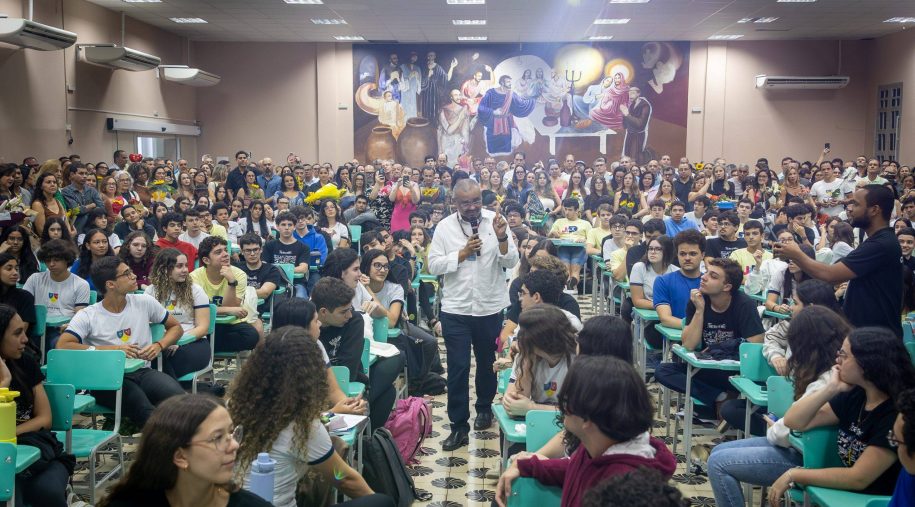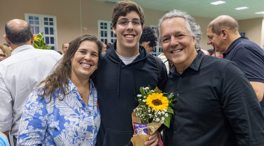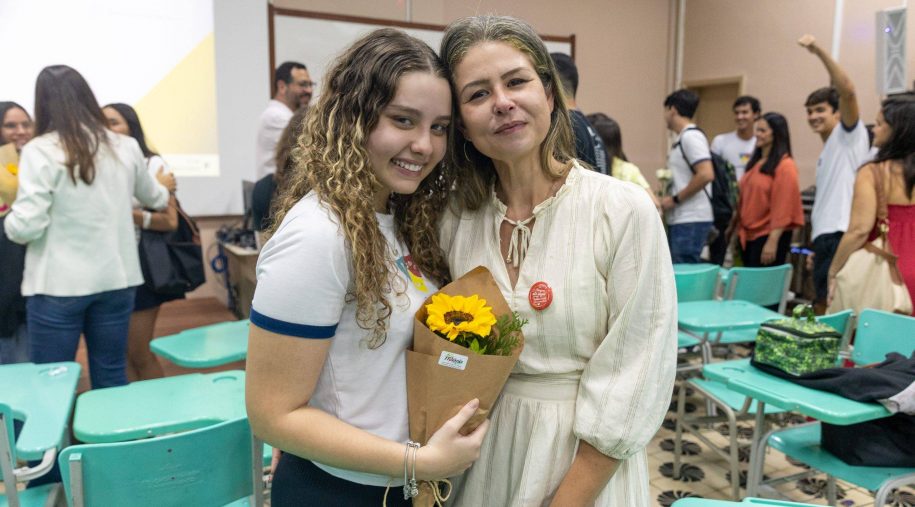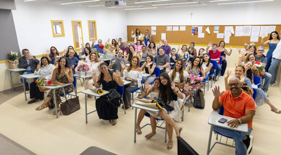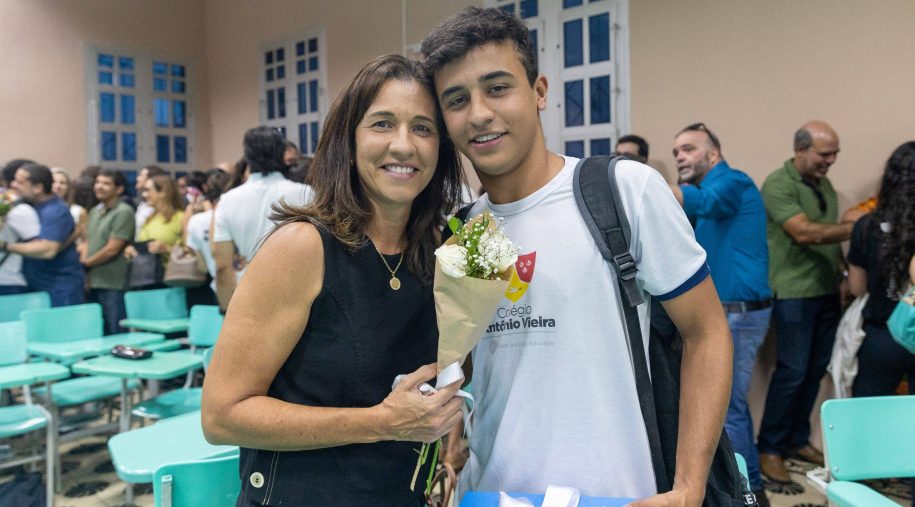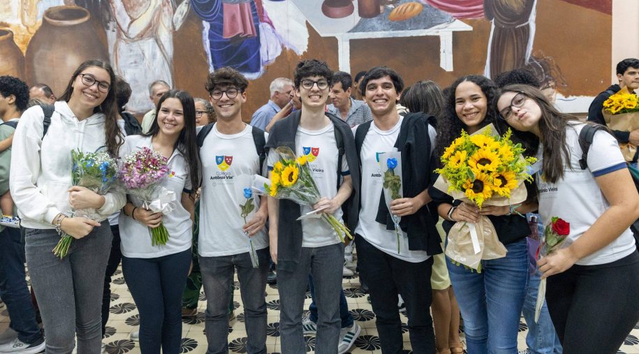 Em dia especialmente emocionante, os pais e demais familiares dos estudantes da 3ª série do Ensino Médio do Colégio Antônio Vieira puderam homenagear os estudantes com flores, no encerramento de uma das aulas da etapa final de revisão para o Exame Nacional do Ensino Médio (Enem), na última quarta-feira (5). O momento especial foi organizado pela equipe pedagógica do Vieira, com uma programação com músicas e orações conduzidas pela equipe de Formação Cristã, além de discursos emocionados de membros do Conselho Diretivo do Vieira e colaboradores de diversos setores do colégio que acompanharam a rotina dos jovens nesse último ano da etapa escolar.