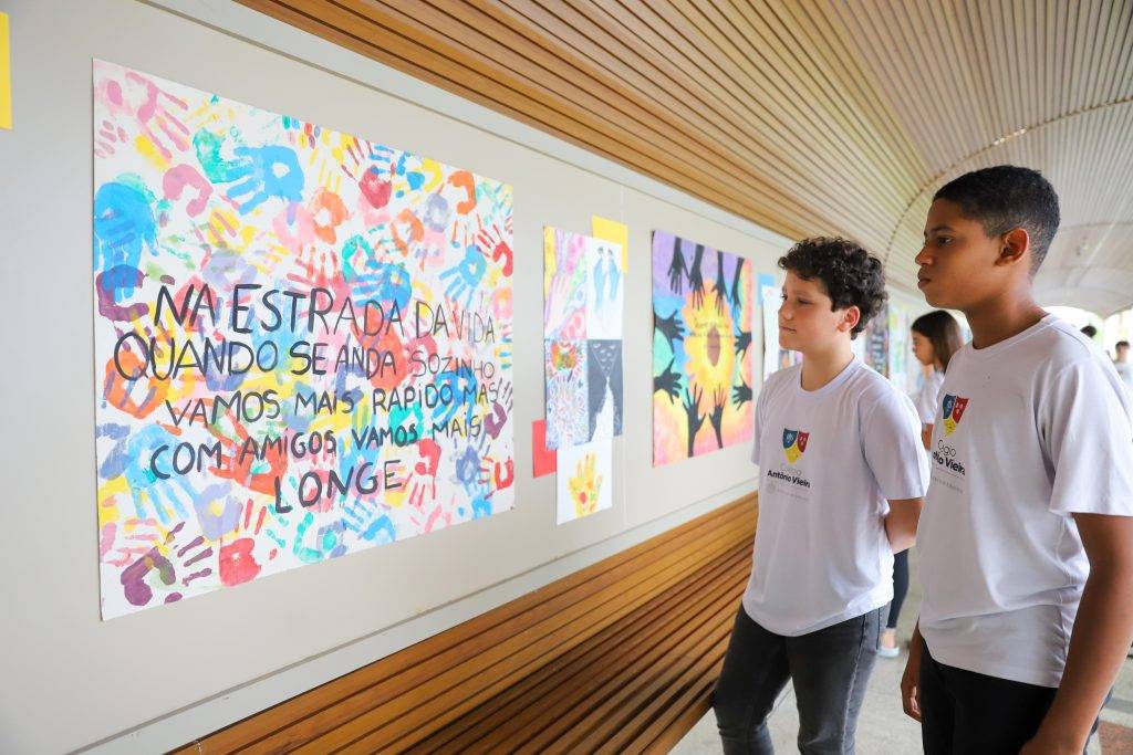 Os estudantes do 9º ano do Ensino Fundamental (EF) do Colégio Antônio Vieira assinam as produções artísticas da exposição “Mãos do Afeto: um entrelaçar de almas”. A mostra de painéis com pinturas, atualmente em cartaz na Passarela da Arte, propõe uma reflexão sobre identidade, cuidado e responsabilidade coletiva.