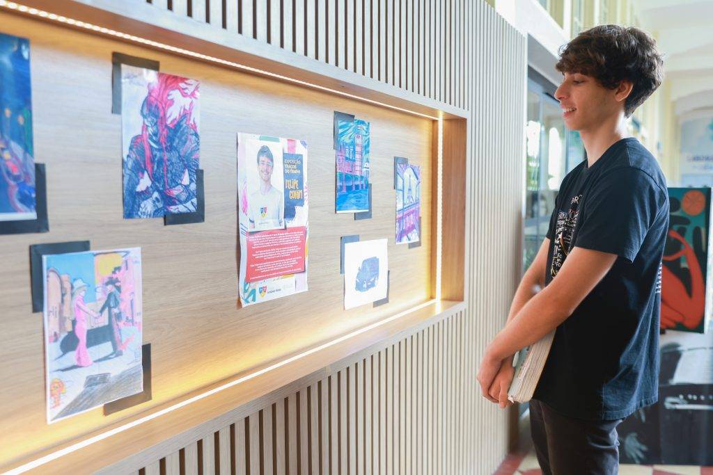 O talento e a sensibilidade artística do estudante Felipe Cohim, da 3ª série do Ensino Médio do Colégio Antônio Vieira, ganham destaque na nova exposição do Projeto LiterArte, da Biblioteca Jorge Amado. A mostra Traços do Tempo fica em cartaz no painel expositivo do espaço até o dia 30 de novembro, reunindo alguns desenhos que expressam o olhar criativo do jovem sobre temas diversos, como astronomia, cotidiano e cultura digital. O evento fecha a programação 2025 do projeto que consolidou a biblioteca do Vieirão como um espaço para expressão artística dos estudantes da unidade, destinada aos alunos do 8º ano do Ensino Fundamental à 3ª série do Ensino Médio.
