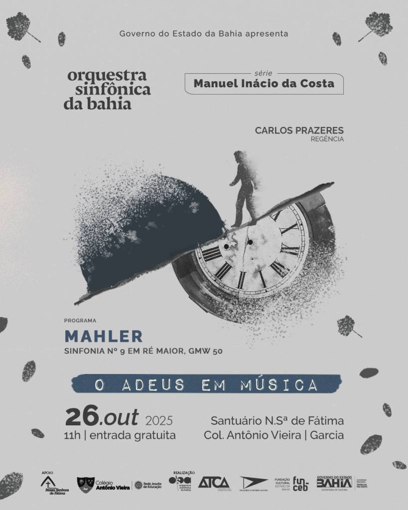 A Orquestra Sinfônica da Bahia (Osba) volta a se apresentar gratuitamente, neste domingo (26), às 11h, no Santuário Nossa Senhora de Fátima, localizado no Colégio Antônio Vieira, no Garcia. Sob a regência do maestro Carlos Prazeres, a Osba interpretará a ‘Nona Sinfonia’ do compositor checo-austríaco Gustav Mahler (1860-1911), em uma apresentação que leva o título de ‘O Adeus em Música’. A entrada é sujeita à lotação do espaço, que abrirá ao público a partir das 10h30. O local conta com estacionamento gratuito, sujeito à disponibilidade. O evento integra a Série Manuel Inácio da Costa.