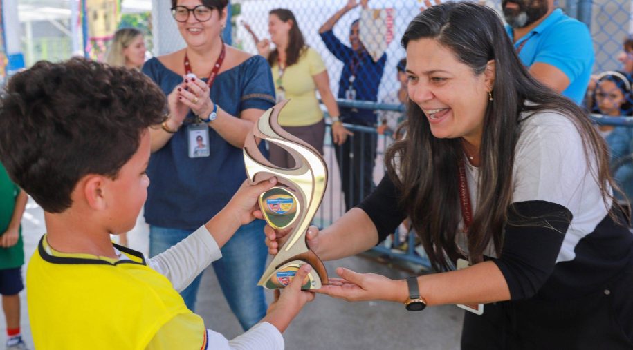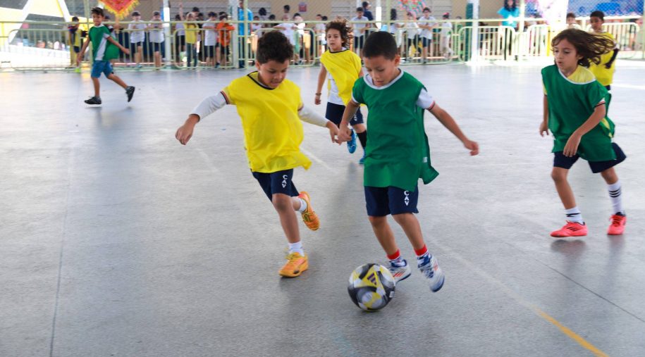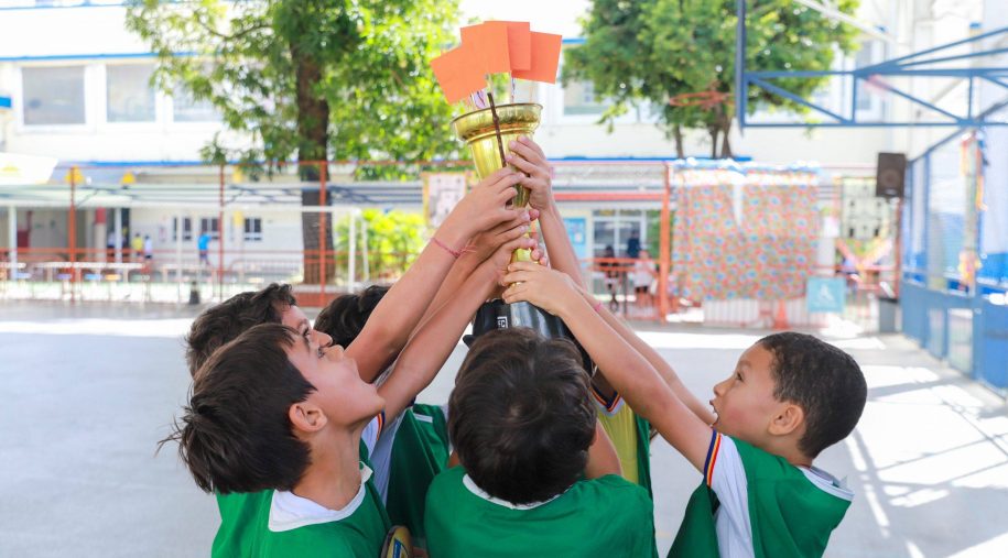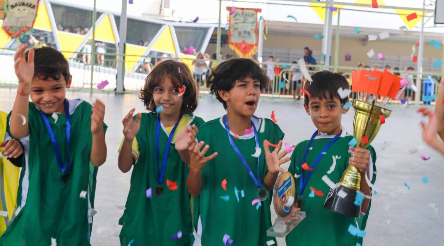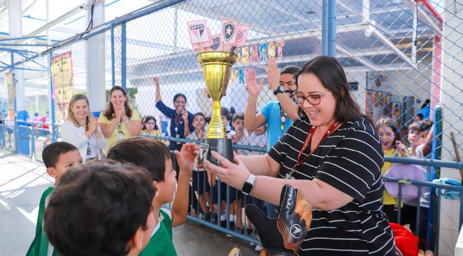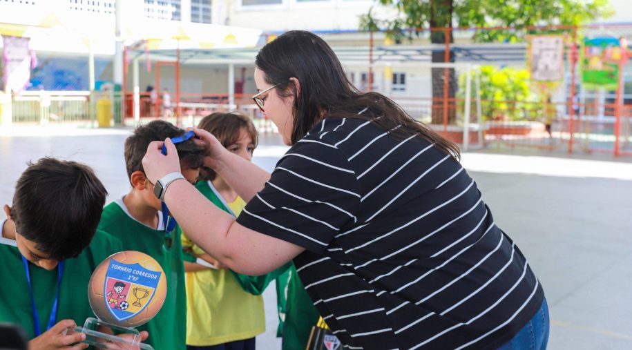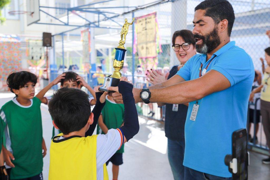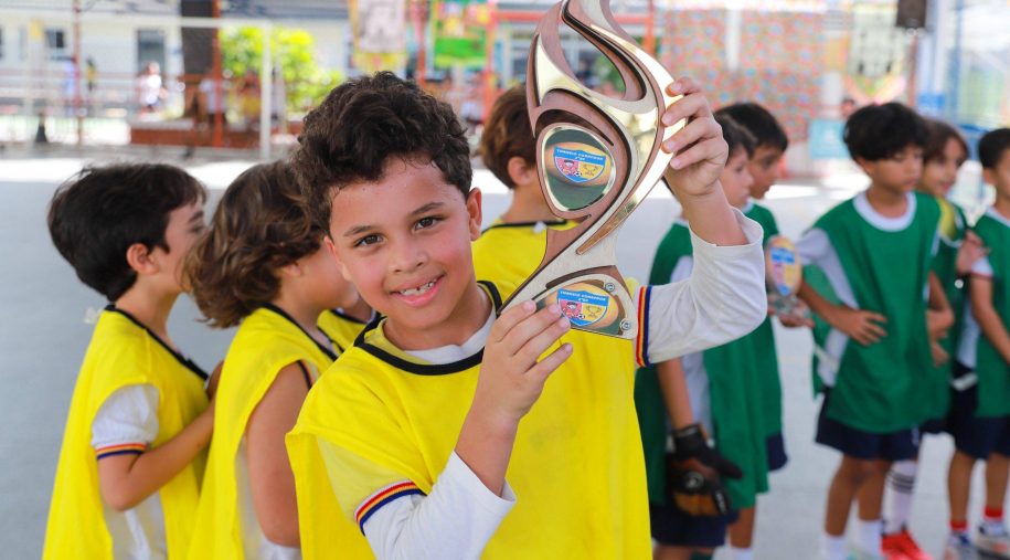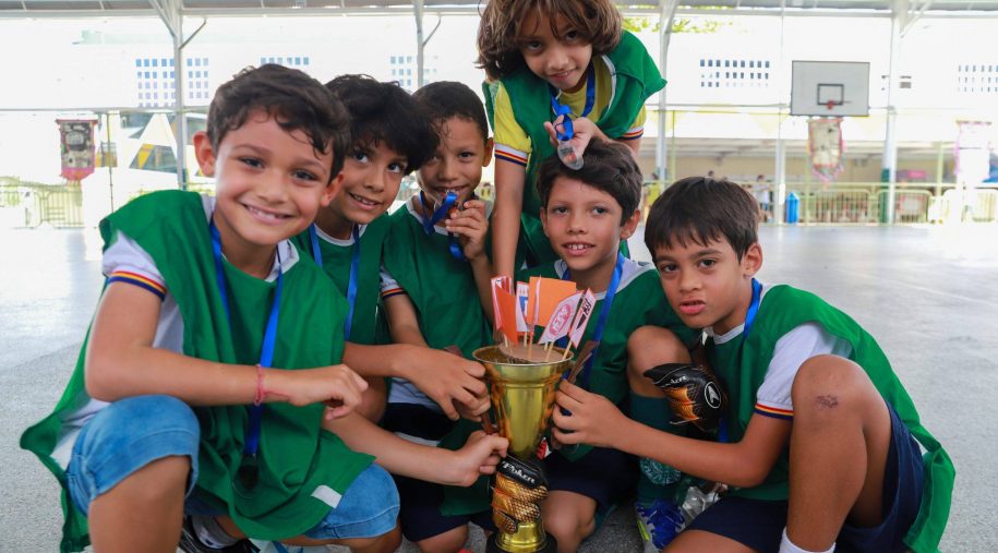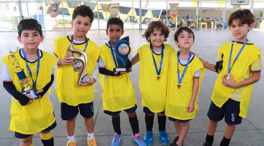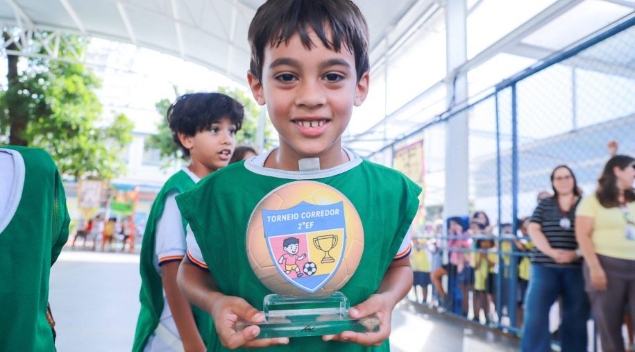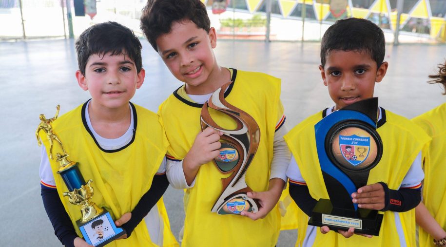 No Vieirinha, os craques do 2º ano do Ensino Fundamental (EF) fizeram bonito e celebraram mais uma edição de sucesso do Torneio do Intervalo Masculino. O time do São Paulo consagrou-se campeão com vitória de 3 X 2 sobre o Botafogo. A iniciativa do evento é do colaborador Denilson Leão, do Serviço de Vida Comunitária (Sevic). Ele organizou o campeonato que já acontecia de forma improvisada na hora do recreio, contando com o apoio da equipe pedagógica. Além dos troféus para os times campeão e vice, foram também premiados o artilheiro (Bento), o melhor jogador (Luiz Henrique) e o gol mais bonito (Nando Borges). A torcida de coleguinhas que acompanhou os jogos também aplaudiu fez bonito na premiação.