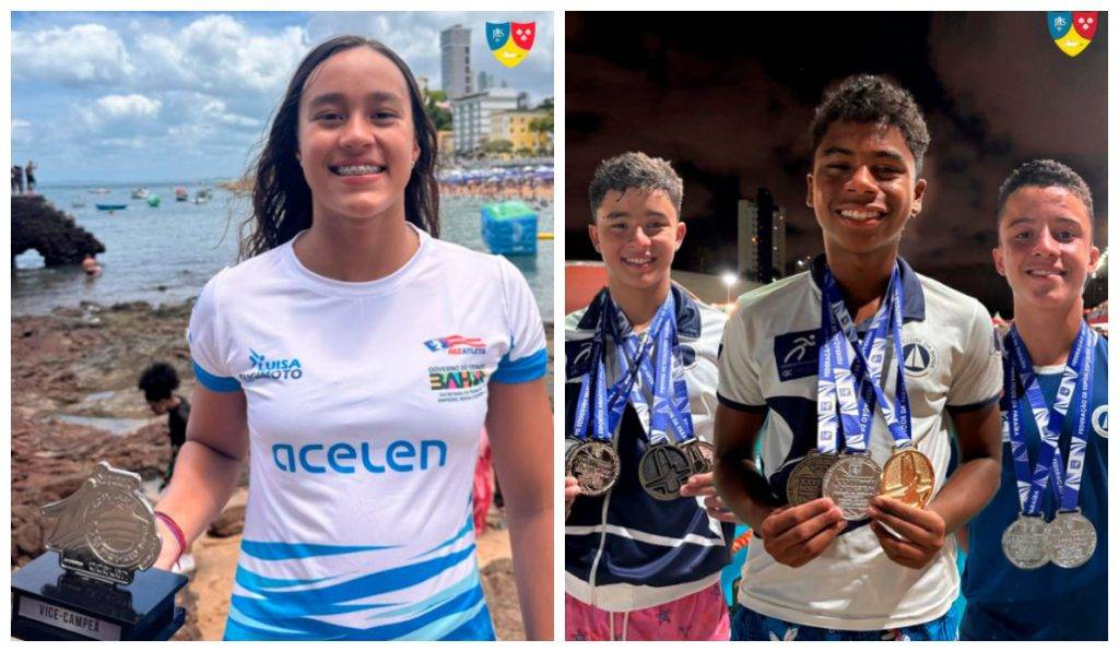 É o caso da Gabriela Lepikson, agora no 7º ano do Ensino Fundamental e uma atleta das águas abertas. Ela iniciou 2025 já ganhando o prêmio de melhor atleta do ano 2024 na categoria Mirim 2 (10 anos) do Campeonato Baiano de Águas Abertas, em premiação concedida pela Federação Baiana de Desportos Aquáticos (FBDA). Agora, no final do ano, quebrando dois recordes no Troféu Walter Júnior (Pré-Mirim a Sênior), último evento promovido pela FBDA neste ano. Os recordes foram conquistados nas provas de revezamento 4×50 livre (2min e 13s) e 4×50 medley (2min e 35s), disputadas no Centro Olímpico de Natação, em Salvador, nos dias 12 e 13 de dezembro. O colega de série João Vitor Mendes integrou a equipe nas duas conquistas. Ele também recebeu o prêmio de atleta mais eficiente da categoria Petiz 1.